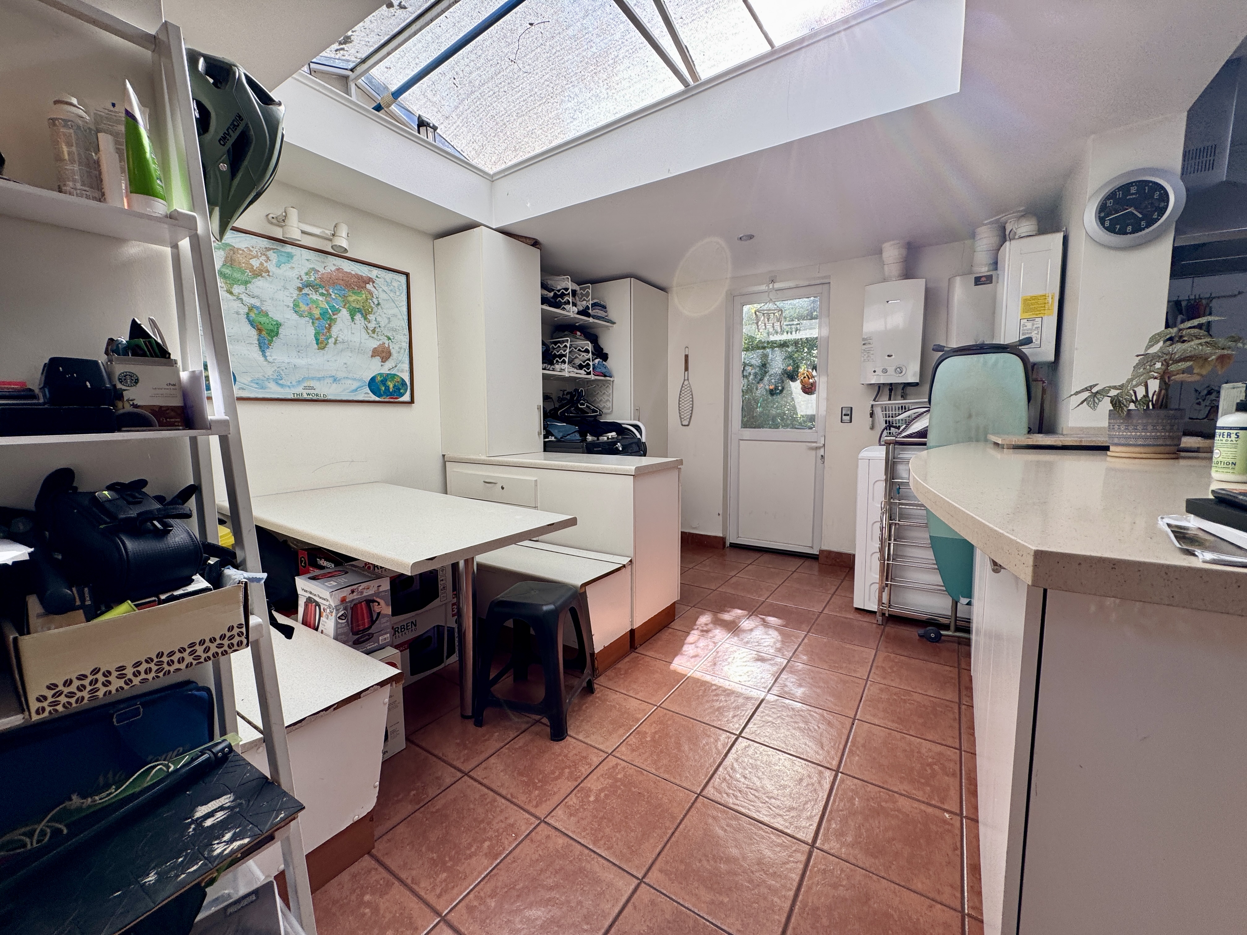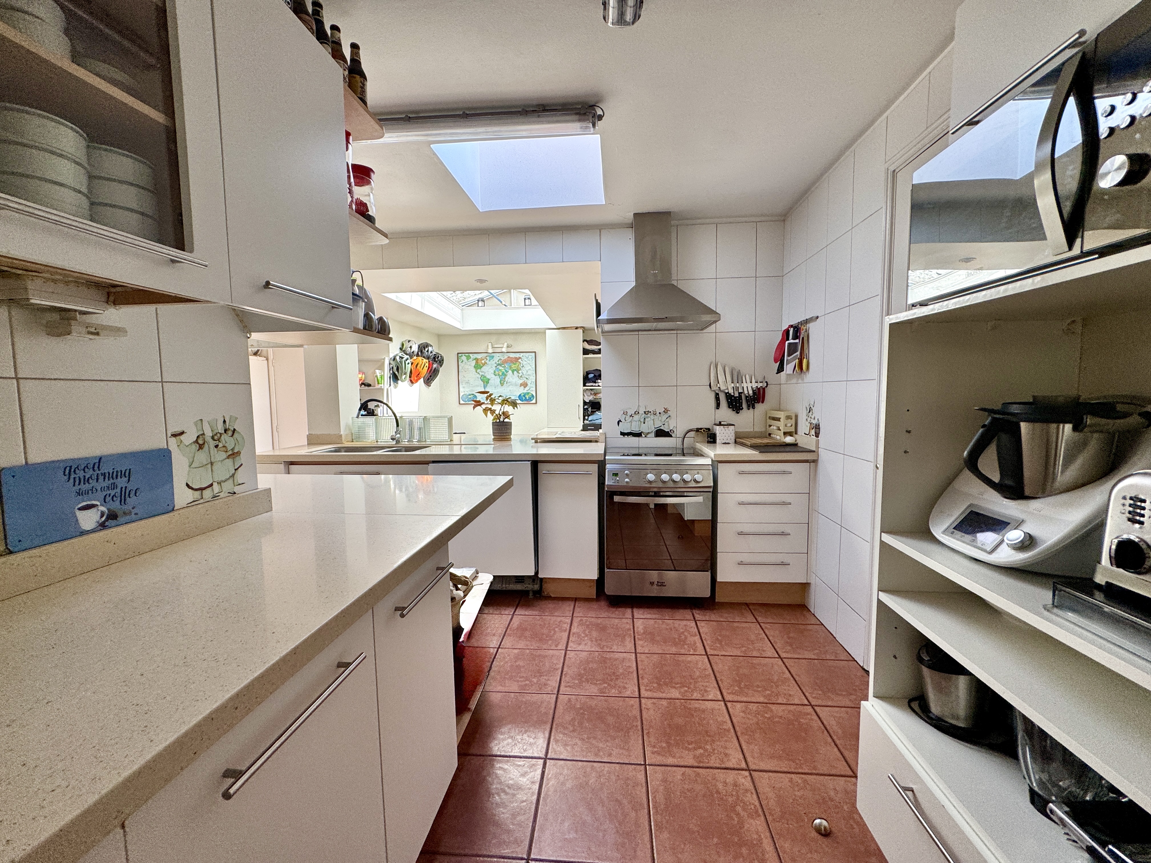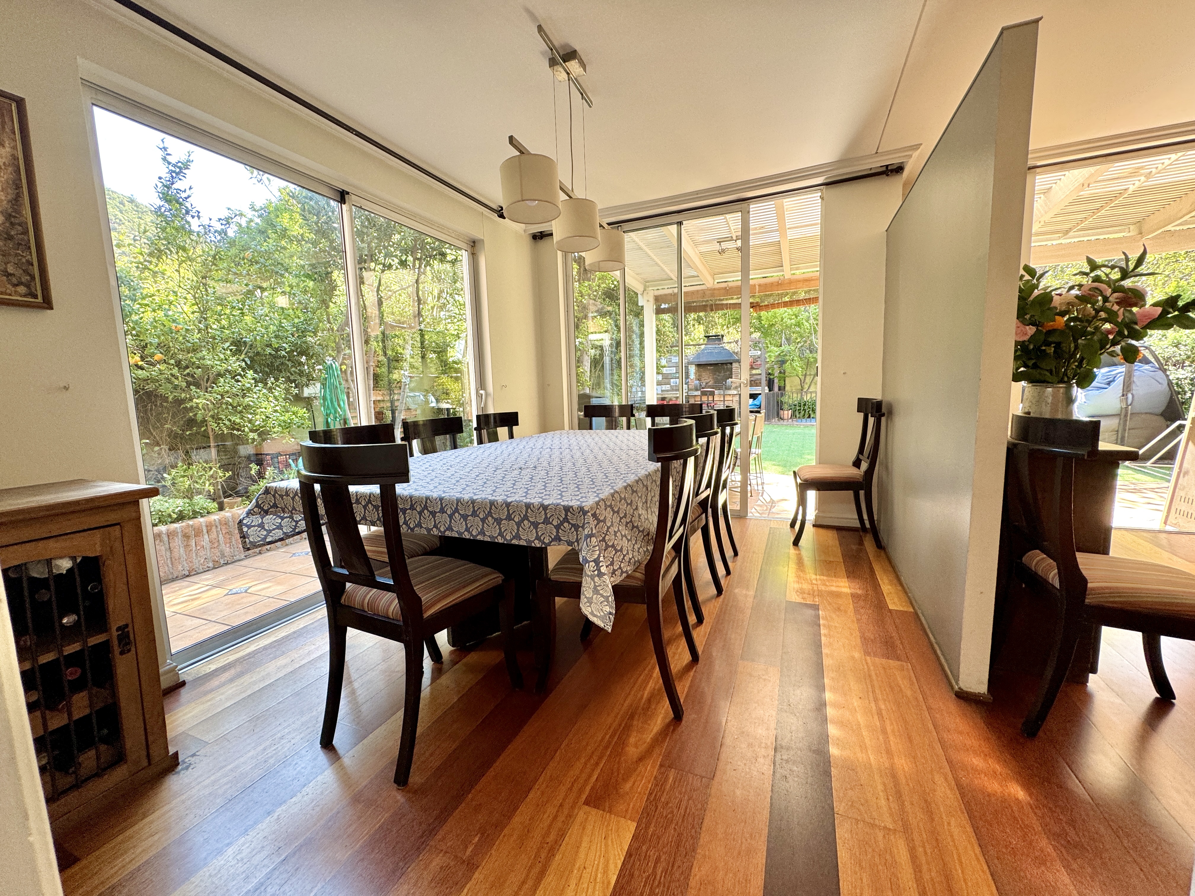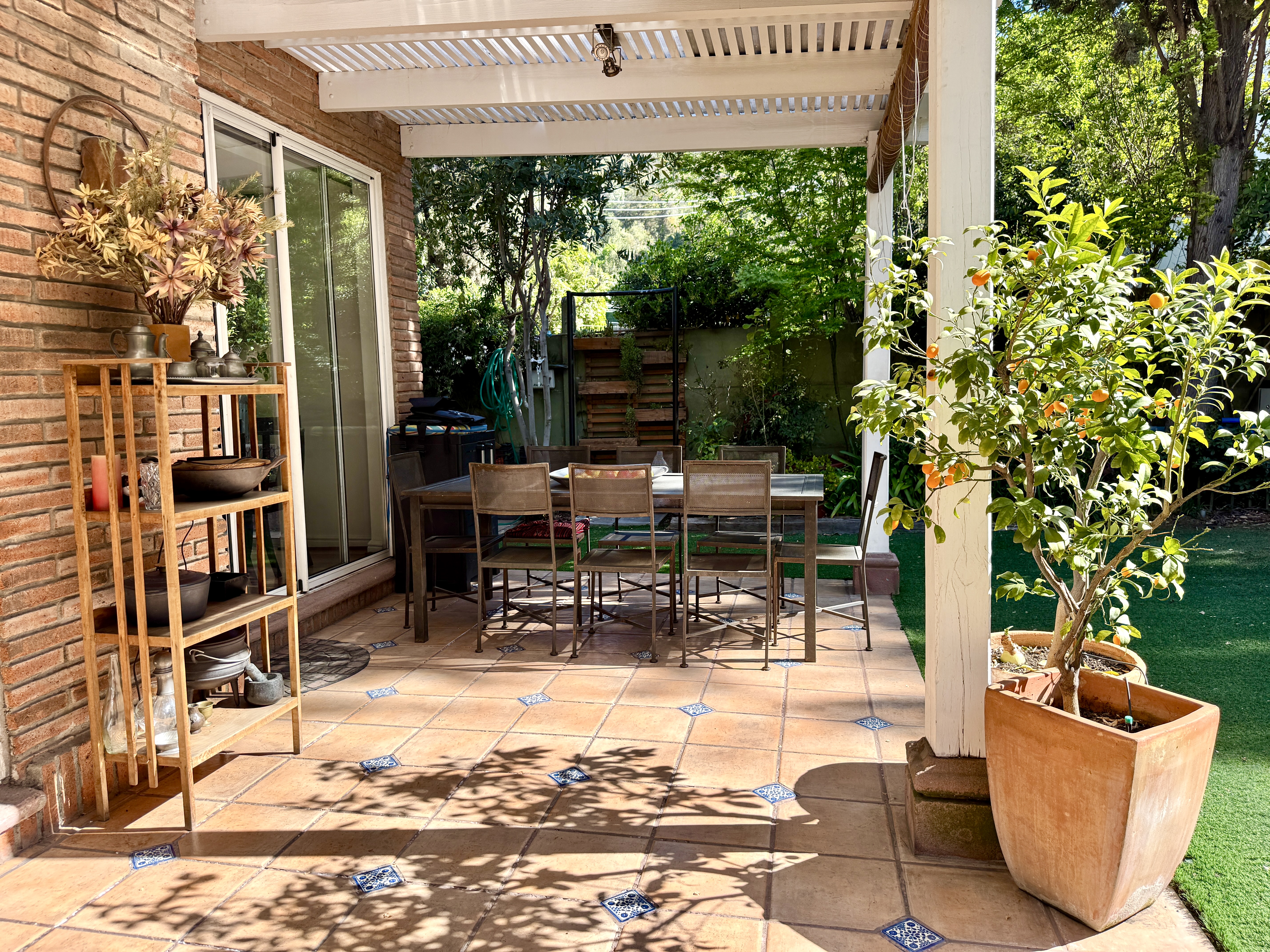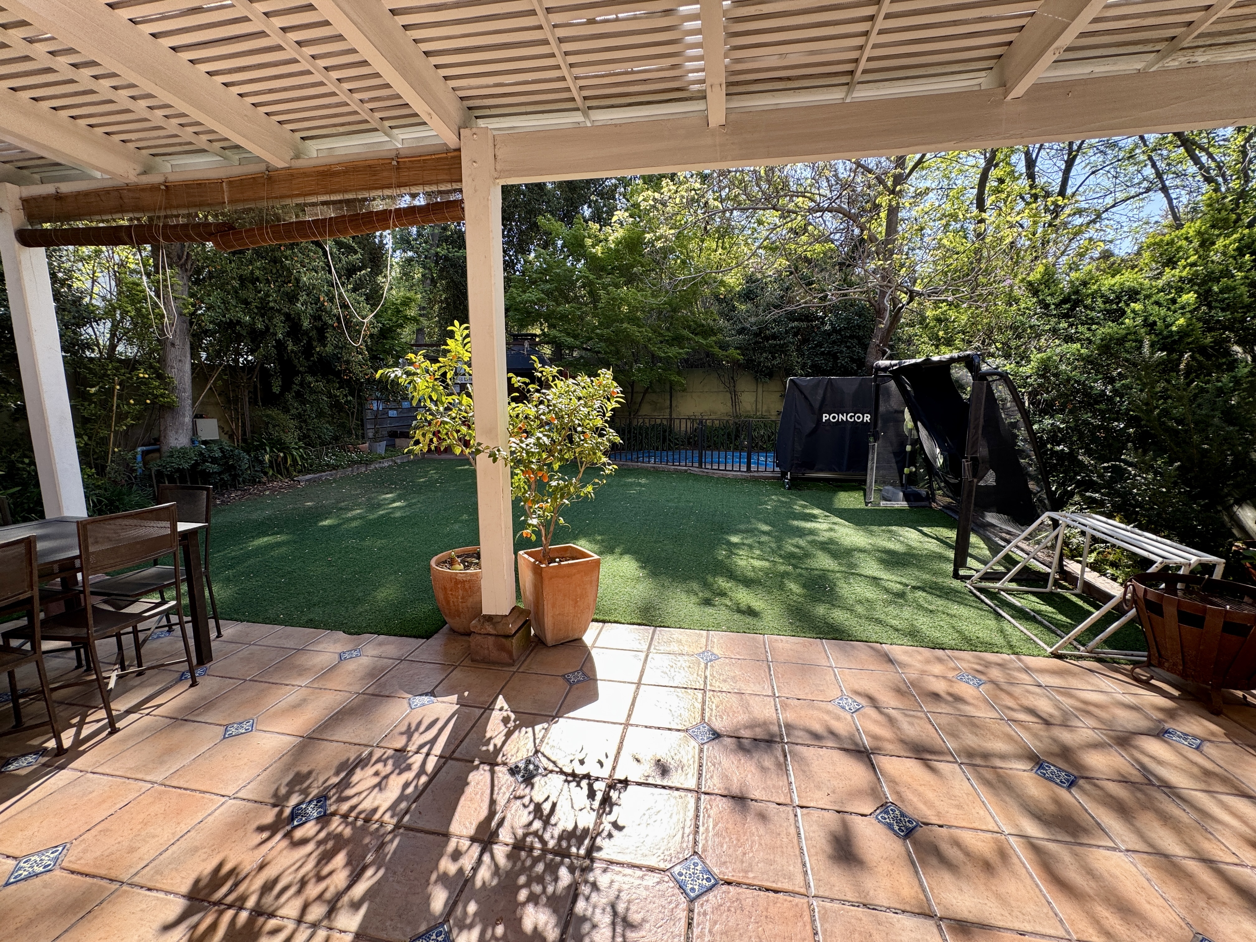 Primer piso: Hall de entrada, escritorio, baño de visitas. Living y comedor con salida a terraza techada. Jardín con pasto sintético, piscina con calefactor. Quincho en obra. Gran cocina, muy luminosa. Dormitorio y baño de servicio.